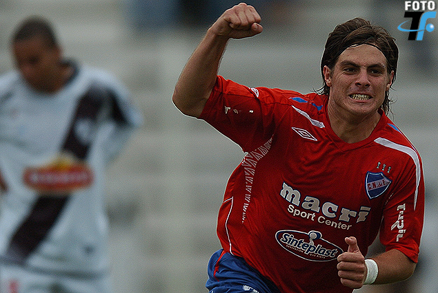 Bruno Fornaroli en el festejo de gol. Lo sufre Cristiano Gomes. Nacional ganó 3:1 en Jardines en 2008.