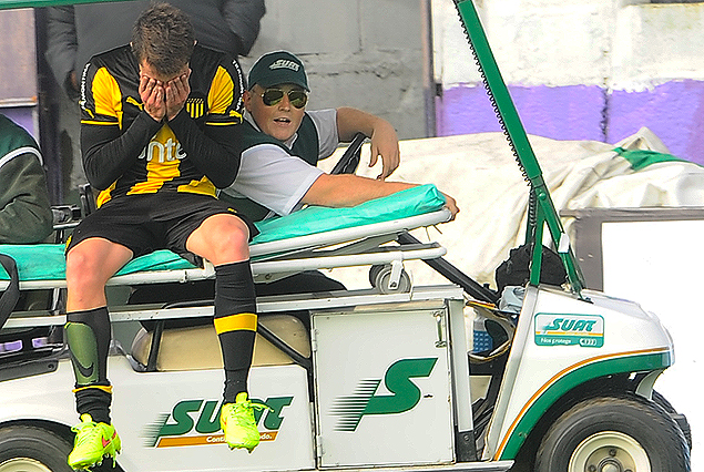 Alejandro Silva se tapa la cara con sus manos en gesto de dolor, al ser retirado de la cancha en el carro móvil. Sufrió esguince de tobillo derecho.
