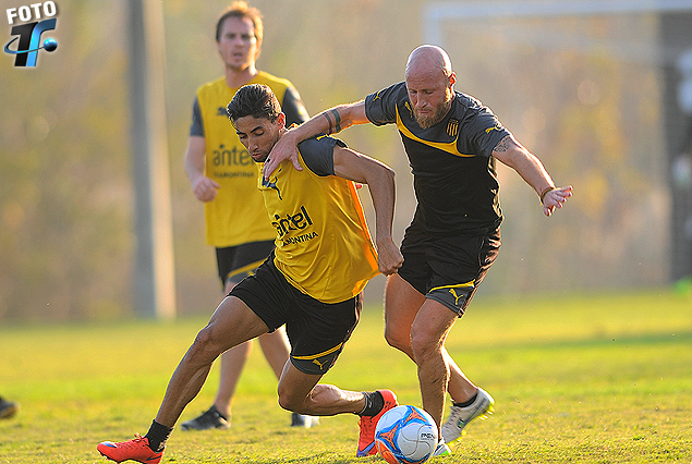 Jonathan Urretaviscaya trata de escapar a la marcación de Marcel Novick en la práctica de fútbol. Urreta fue autor de un verdadero golazo.