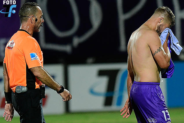 El árbitro Javier Bentacor apura a Germán Rivero que sin camiseta y a paso cansino abandona la cancha.