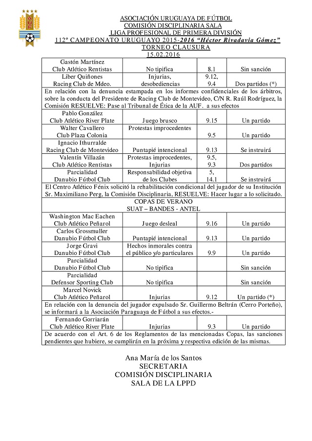 Sesionó anoche la Comisión Disciplinaria y abordó las carpetas que se habían acumulado producto de las copas de verano, más las dos primeras fechas del Torneo Clausura (en la primera no habían sesionado producto del feriado de carnaval).