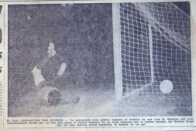 La fotografía muestra el gol de Eusebio ante Peñarol en el estadio Centenario el 19 de setiembre de 1961, en el tercer partido decisivo de la final de la Copa Intercontinental. La clavó en el ángulo superior derecho del arco de la tribuna Colombes, en el mismo sitió que el brasileño Paulinho el jueves. Maidana se arrojó -al igual que Martín Silva-, pero era imposible llegar. Recuerdos nostálgicos que se ligan con el presente.