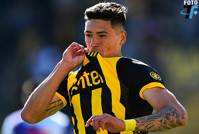 Darwin Núñez y el sagrado beso al escudo en el festejo del primer gol aurinegro.