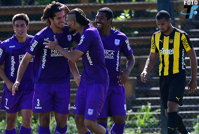 Joaquín Varela, el autor del tercer gol violeta, recibe el abrazo de Emiliano Alvarez, detrás el brasileño Jeferson.