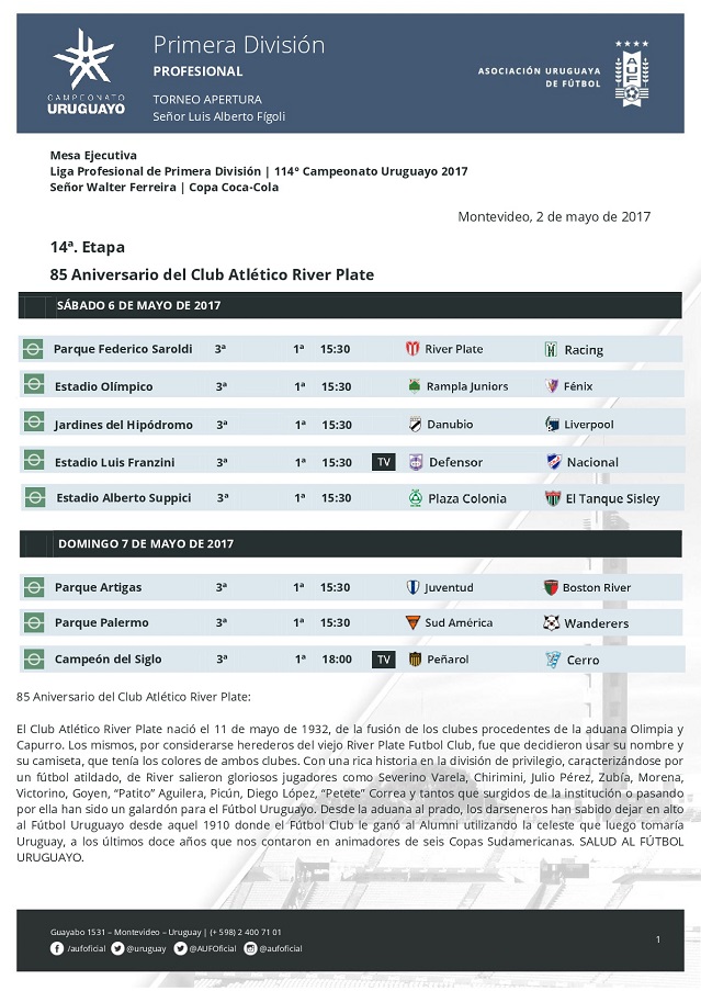 La Mesa Ejecutiva y Tenfield volvieron a modificar el horario del partido entre Peñarol y Cerro del próximo domingo en el Campeón del Siglo por la decimocuarta fecha del Torneo Apertura. El encuentro regresa a su horario original de las 18.00.