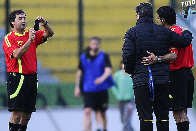 Los árbitros locales, con sus propios teléfonos celulares, se dieron el gran gusto de posar en plena cancha con Pablo Bengoechea, entrenador aurinegro.