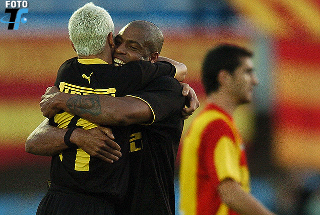 Fabián Estoyanoff en el festejo de gol con José María Franco en 2008. Atrás aparece Francisco Salomón (hijo).