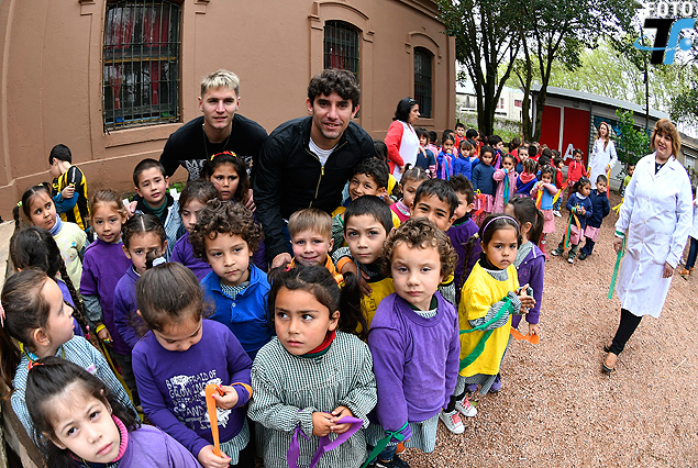 Guillermo Varela y Mathías Corujo junto a los niños del Jardín de Infantes del Pueblo Peñarol.