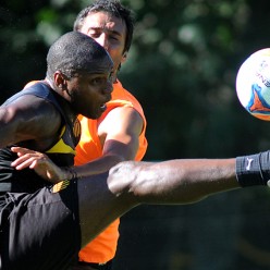 Marcelo Zalayeta en el intento del control de la pelota frente a la marca de Ignacio Pallas en Los Aromos.