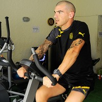 Damián Macaluso a todo pedal en bicicleta. El lunes retoma los trabajos en cancha.