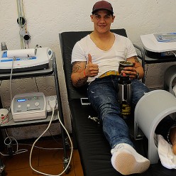 Carlos Núñez -se desplaza con muletas para no apoyar el pie izquierdo luego del esguince doble de tobillo-, realiza fisioterapia y ultrasonido en la sala de sanidad.