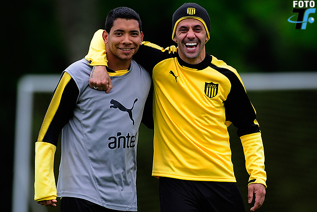 Cristian Palacios y Fabián Estoyanoff con la sonrisa distendida. Peñarol por seguir arriba en el Clausura.
