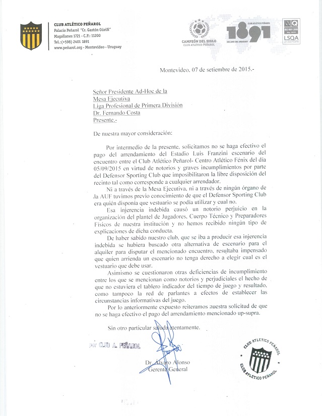 La idea surgió el sábado en el Estadio Luis Franzini y fue una propuesta realizada por el Dr. Jorge Barrera, delegado de Peñarol, quien le solicitó autorización al presidente Juan Pedro Damiani para presentar una nota en la AUF, solicitando no pagar el arrendamiento del escenario violeta, como consecuencia del vestuario que le fue otorgado al equipo aurinegro.