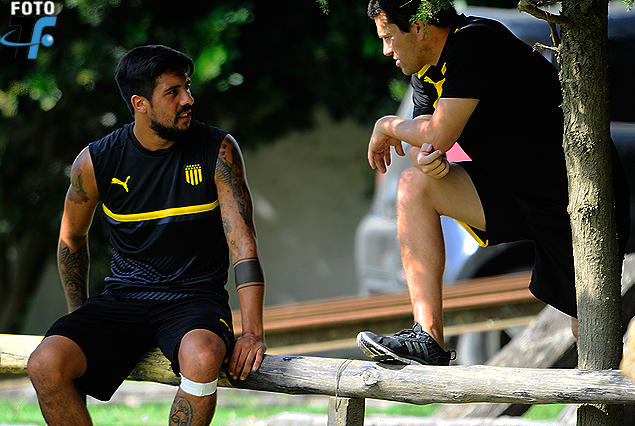 Ramón Arias en Los Aromos con Mauricio Velázquez (fisioterapeuta) en el retorno del plantel con la mira puesta en la Copa.