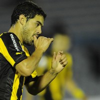 Luis Aguiar en el festejo del primer gol aurinegro. Peñarol ganó y sigue vivo en la Copa.