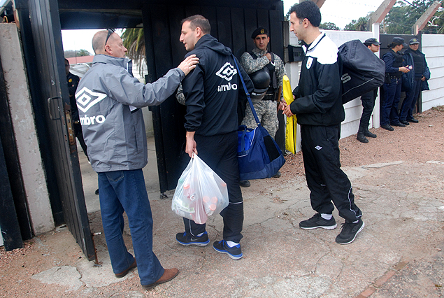 El árbitro Pablo Giménez y los asistentes en el ingreso al Parque Viera, en la cancha de Wanderers se juega a puertas cerradas.