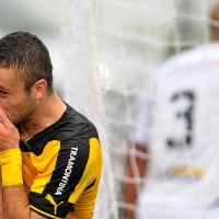 El festejo de Jonathan Rodríguez, besando la camiseta al poner el segundo para Peñarol. El pedrense Brian De Barros lo sufre dentro del arco.
