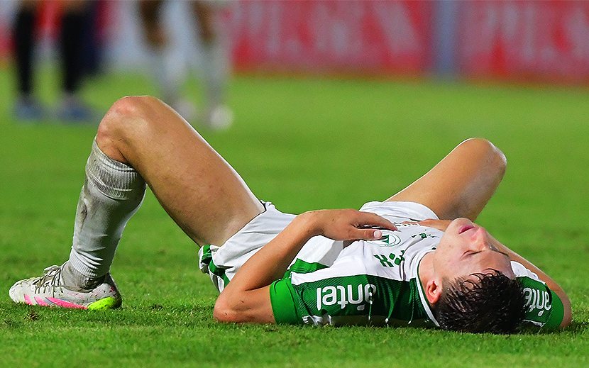 Matías Velázquez (tapado), Ángel Cayetano y el capitán Facundo Píriz, con rostro de tristeza y desazón, tras confirmarse el descenso de Plaza Colonia.
