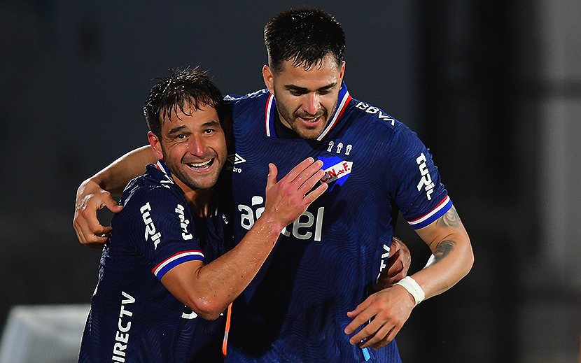 El abrazo entre Nicolás Lodeiro y la figura de Nacional, Maximiliano Gómez, luego de que el equipo pasara a ganar.