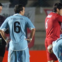 El único partido que Roldán le arbitró a Uruguay. Empate con Perú en la Copa América 2011. Allí se lo ve anotando algo delante de Godín mientras un peruano consuela a Lugano.