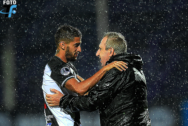 Conocidos… Nicolás Prieto y Gerardo Pelusso, en el abrazo del reencuentro bajo la lluvia. El hoy volante franjeado fue dirigido por el entrenador en su último pasaje por Nacional en 2014.