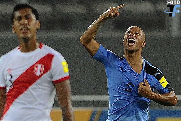 André Carrillo sufre en primer plano, detrás Carlos Sánchez festeja el gol uruguayo.
