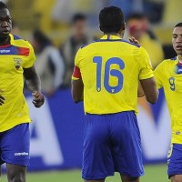 Los ecuatorianos Jefferson Montero autor, y Antonio Valencia celebran el gol, Felipe Caicedo retorna al medio del campo.