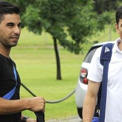 Maximiliano Barreiro, el argentino que llegó de Ecuador, con el técnico Mauricio Larriera.