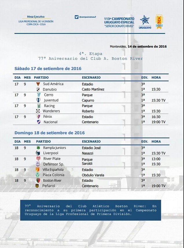 Así lo determinó la Mesa Ejecutiva a manera de reconocimiento a la histórica primera participación en la Liga de Primera División del Club Atlético Boston River, que en su aniversario número 77 cumplido en febrero pasado y tras muchos años de afiliación a la AUF, lo tiene jugando por vez primera en el círculo de privilegio.