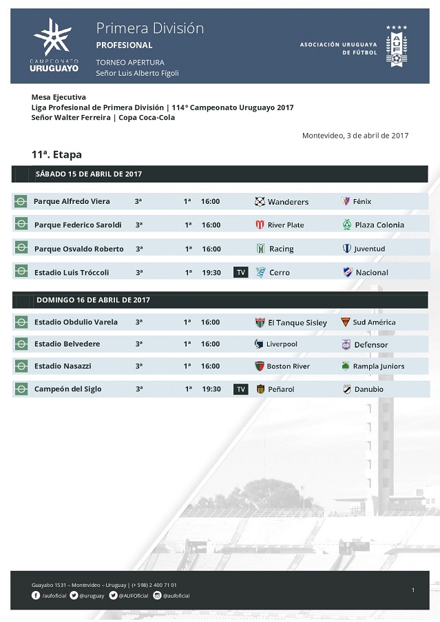Cerro – Nacional jugarán ese sábado a la hora 19.30 en el Estadio Luis Tróccoli. Peñarol – Danubio lo harán el domingo 16 a la misma hora en el Estadio Campeón del Siglo.