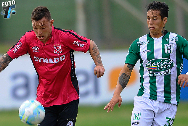 Adrián Colombino con el balón es marcado por Jesús Trindade.