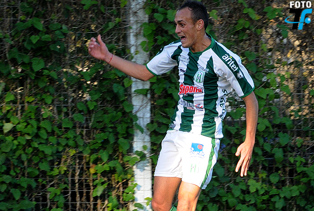 Nicolás Sosa con la boca llena de gol en el salto triunfal.