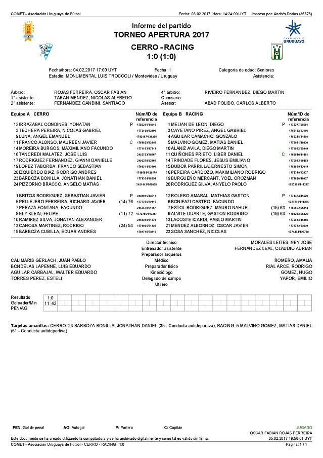 Cerro le ganó a Racing 1 a 0 en la primera fecha del Torneo Apertura en partido jugado el sábado 4 de febrero en el Estadio Luis Tróccoli.