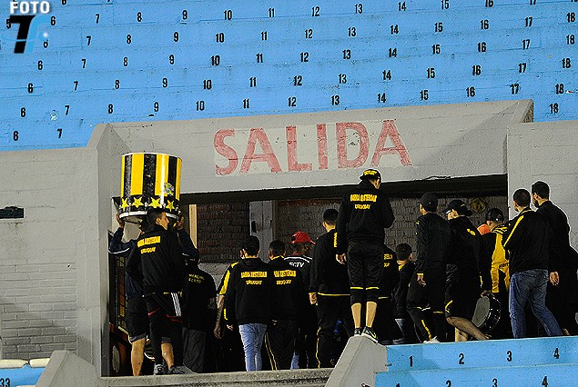 Los hinchas del Peñarol se retiran de la tribuna Amsterdam, tras la suspensión del partido.