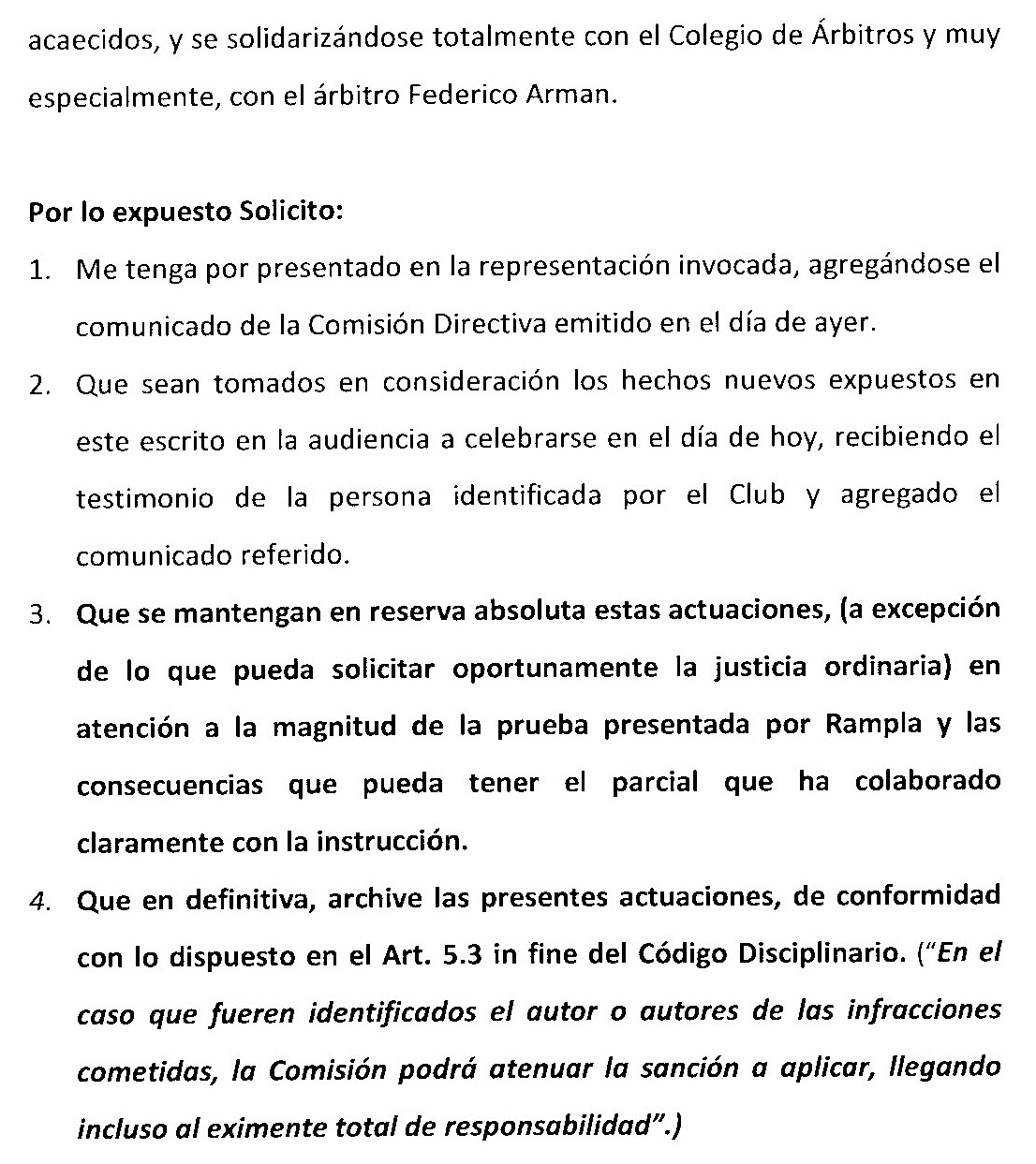 Una vez localizado y tras hablar con él, en principio no asumió su responsabilidad. Tras varias reuniones, el hincha, que además es socio de la institución, admitió su culpabilidad. Una vez logrado eso, los dirigentes encauzaron sus energías en solicitarle al parcial que colabore con la institución prestando su declaración ante la Comisión Disciplinaria, asumiendo ante los integrantes de la misma su culpa y solicitando las debidas disculpas al órgano jurisdiccional y al árbitro Federico Arman en particular.