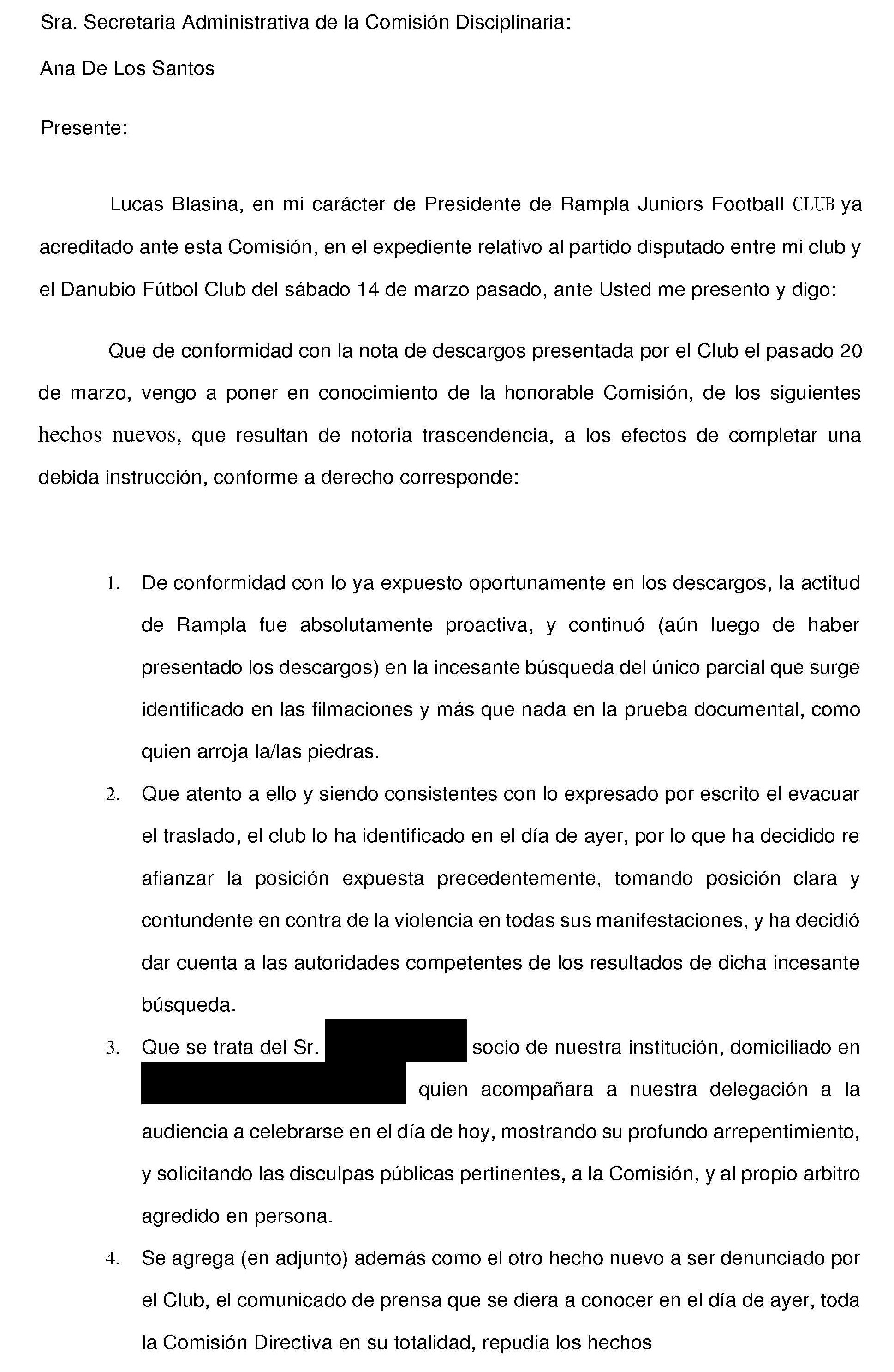 Una vez convencido el hincha, Rampla Juniors presentó en ésta jornada un escrito ante la Comisión Disciplinaria donde expresa los pasos dados y la presentación del “testigo clave”.