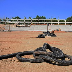 Los trabajos de drenaje en el campo en marcha, atras la Tribuna Amsterdam camino a ser terminada.