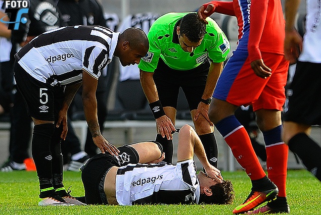 Gastón Bueno en el piso y su ostensible gesto de dolor. Sufrió esguince de rodilla.