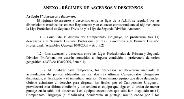 Los ascensos y descensos entre las dos divisiones profesionales de la AUF tienen un capítulo aparte en el Reglamento General  que está comprendido en el “Anexo – Régimen de Ascensos y Descensos”. Allí se contemplan todas las posibilidades para la definición de la pérdida de categoría y los requisitos que deben cumplir los clubes de Segunda Profesional para ascender.