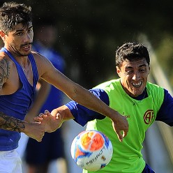 Enzo Pérez, en Juventud, en carrea con “Rulo” Varela, delantero de Rentistas, el miércoles de fútbol en La Chacra.