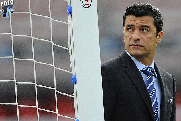 El árbitro brasileño Sandro Ricci chequeando la red del arco de los milagros de Peñarol.