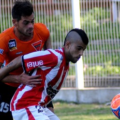 Fabián Bastidas intenta controlar el balón ante la marcación de Juan Alsina.