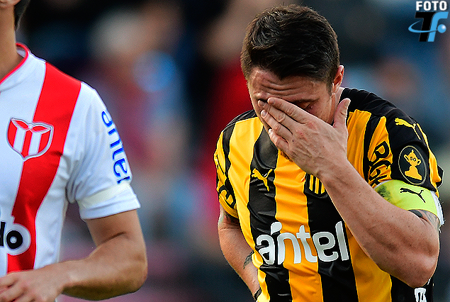 Cristian Rodríguez se tapa la cara lleno de vergüenza. Peñarol perdió el invicto en el Parque Saroldi.