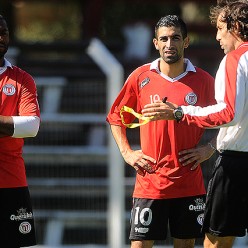 Guillermo Almada en el Saroldi con los delanteros "Morro" García y Michael Santos, de punta a Peñarol.