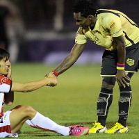 Hamilton Pereira, en el suelo no encuentra consuelo, caballerosamente el colombiano Mosquera le tiende su mano para ayudarlo a reincorporarse.