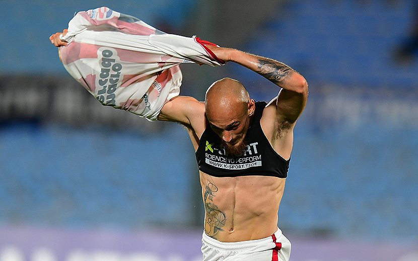 Nicolás Sosa y toda la fuerza del gol en el festejo de la apertura darsenera.