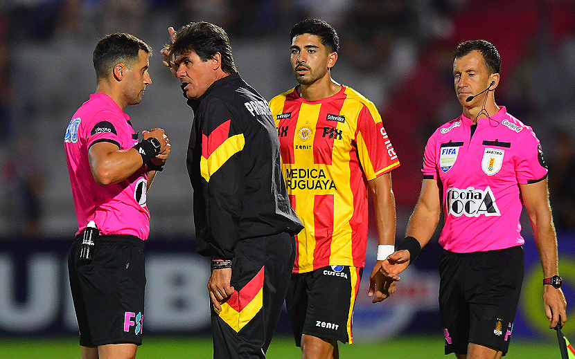 El momento en que el técnico de Progreso, Leonel Rocco, explotó en reclamos contra el árbitro, Gustavo Tejera, tras ser expulsado. Detrás de él, el defensa, Sebastián Cardozo, quien también vio la roja.
