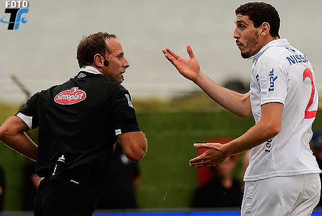 Daniel Fedorczuk ya le mostró la tarjeta amarilla a Agustín Rogel que le reclama a viva voz.