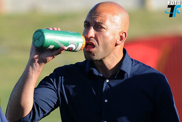 INTENSO CALOR: Una tarde con más de 30 grados en el Obdulio Varela. El intenso calor se hizo sentir en los protagonistas del juego. El DT de Villa Española, Jorge Casanova, hidratándose durante el juego.
