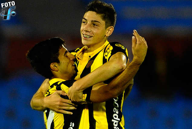 Diego Rossi en el abrazo de gol con Federico Valverde.